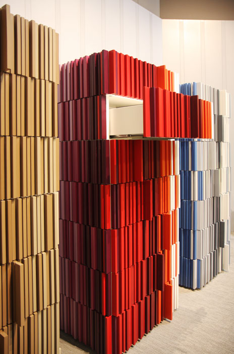 Beautiful Day contenitori. Una scultorea cassettiera rivestita da 798 listelli di varie profondità, suddivisi in nuance di 8 colori in scala cromatica: un esercizio costruttivo di raffinata bellezza e di esasperata difficoltà. Disponibili in serie limitata. Progetto del 2012 per Capo d’opera.